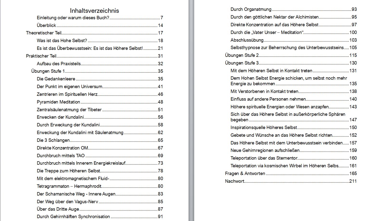 Der praktische Teil enthält detaillierte Übungen in drei aufeinander aufbauenden Stufen – von der grundlegenden Zentrierung über Meditationstechniken bis hin zu fortgeschrittenen Praktiken wie Kundalini-Erweckung, Arbeit mit dem spirituellen Herzen, energetischer Atmung und Kontakt mit geistigen Wesenheiten. Dabei wird Wert auf einfache und umsetzbare Methoden gelegt, die laut Autor nicht nur spirituelle Erkenntnis ermöglichen, sondern auch Heilung, schöpferische Inspiration und seelisches Gleichgewicht fördern.