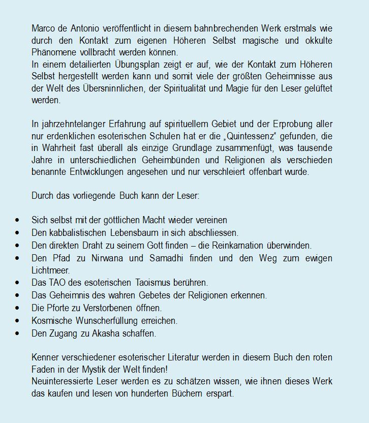 „Der Kontakt zum Höheren Selbst“ ist ein umfassendes Praxisbuch über Spiritualität, Esoterik und Selbsterkenntnis. Marco de Antonio fasst darin über 30 Jahre eigene spirituelle Forschung und Praxis zusammen und präsentiert einen klar strukturierten, anwendungsorientierten Weg zur bewussten Verbindung mit dem sogenannten Höheren Selbst – einem spirituellen Aspekt des Menschen, der als Schnittstelle zur göttlichen Quelle verstanden wird.